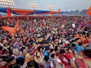 जगह-जगह भक्तों और श्रद्धालुओं की भीड़ उमड़ है और पूरे मार्ग में “जय श्रीराम”, “हर हर महादेव” के नारे लगाए जा रहे है